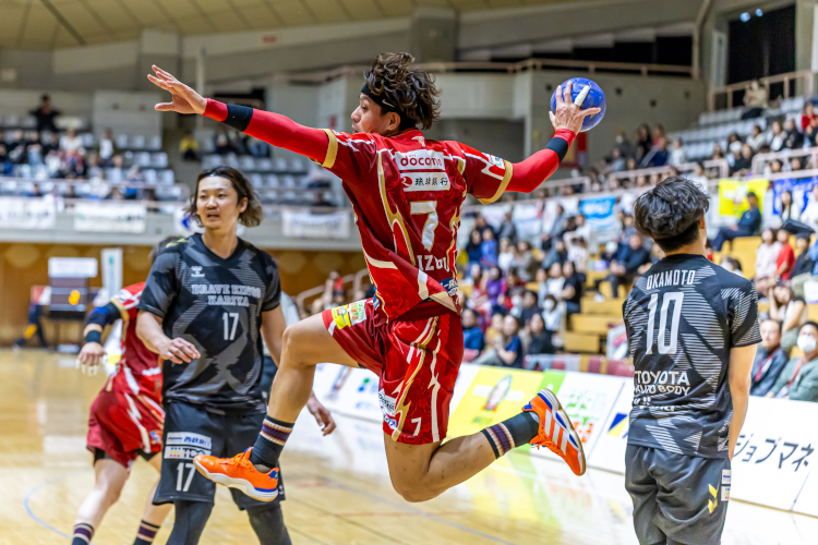 No.14髙橋のアウトカットインでコラソンが先制。刈谷の高いDFを前に連携がうまくいかないコラソンは、6分に1-5と追いかける展開に。劣勢の中、刈谷の固いDFを攻略しようと、No.2野尻が外からのシュートで打開をはかっていく。14分、刈谷に退場者が出る時間帯でじわじわ追い上げをはかるコラソン。また、No.30島袋のGKシュートもみせ会場をわかしていく。No.2野尻の7mTやNo.18尾﨑のカットインで1点差とし、コラソンムードになっていく。27分には、No.19布施のステップシュートで13-13とし、同点で前半を折り返す。