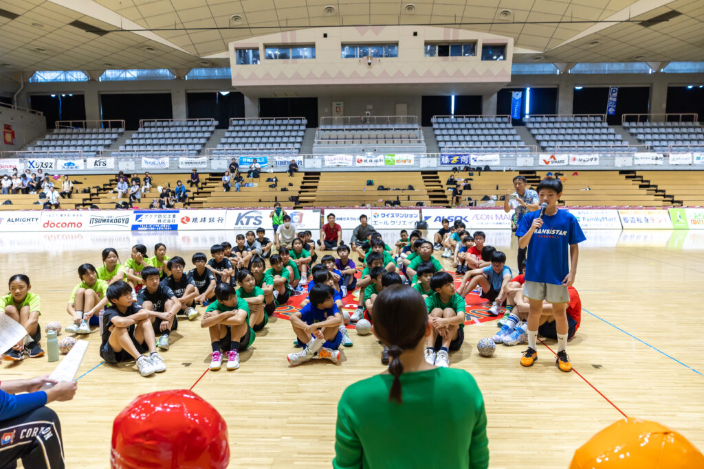 人権講話では、チームワーク・相手を尊重すること・いじめなどをテーマに選手・スタッフから子ども達にお話しました。